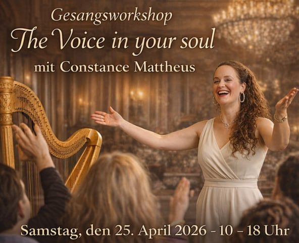 Am Tag nach dem Harfenkonzert, dem 25. April, findet der intensive Gesangsworkshop „The Voice in Your Soul“ statt. Unter der Leitung der Musik- und Traumatherapeutin Constance Mattheus entdecken die Teilnehmenden ihre Stimme als Werkzeug für Ausdruck, Selbstregulation und innere Verbindung. Der Workshop verbindet musikmedizinische Erkenntnisse mit Atem-, Körper- und Klangarbeit. Durch gemeinsames Singen, Vokalisationen, Bodypercussion, Klangreisen und Lieder aus verschiedenen Kulturen entsteht ein geschützter Raum, in dem die eigene Stimme frei erforscht und neu erfahren werden kann.